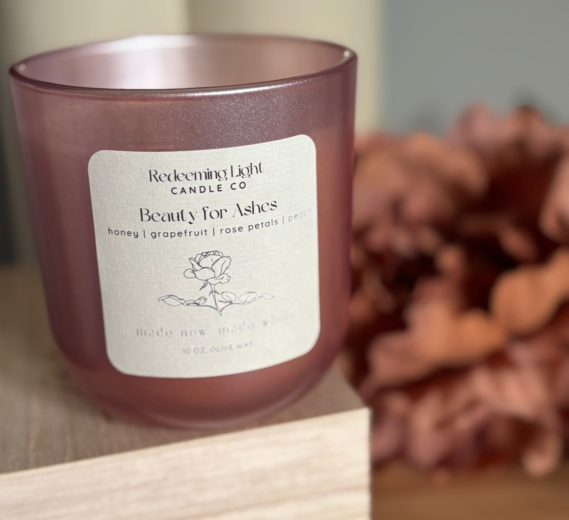Soft notes of honey, grapefruit, rose petals, and peach come together in a fragrance that feels tender and renewing. Inspired by the promise made new, made whole, this candle is a reminder that God brings beauty from every broken place.